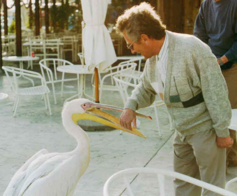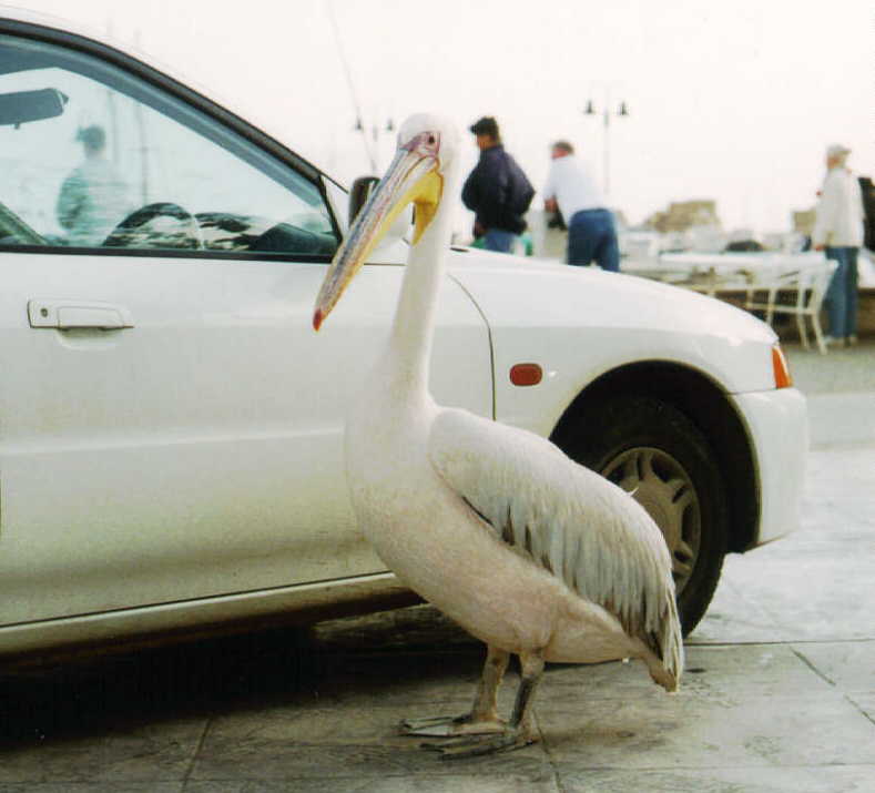 Gaststätte mit dem Namen Pelikan. Das Maskottchen läuft auf der Straße herum und untersucht auch schon mal ein Auto. |